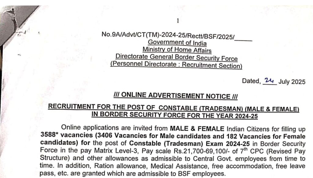 BSF CONSTABLE TRADESMAN भर्ती 2025 कुल पद 3588