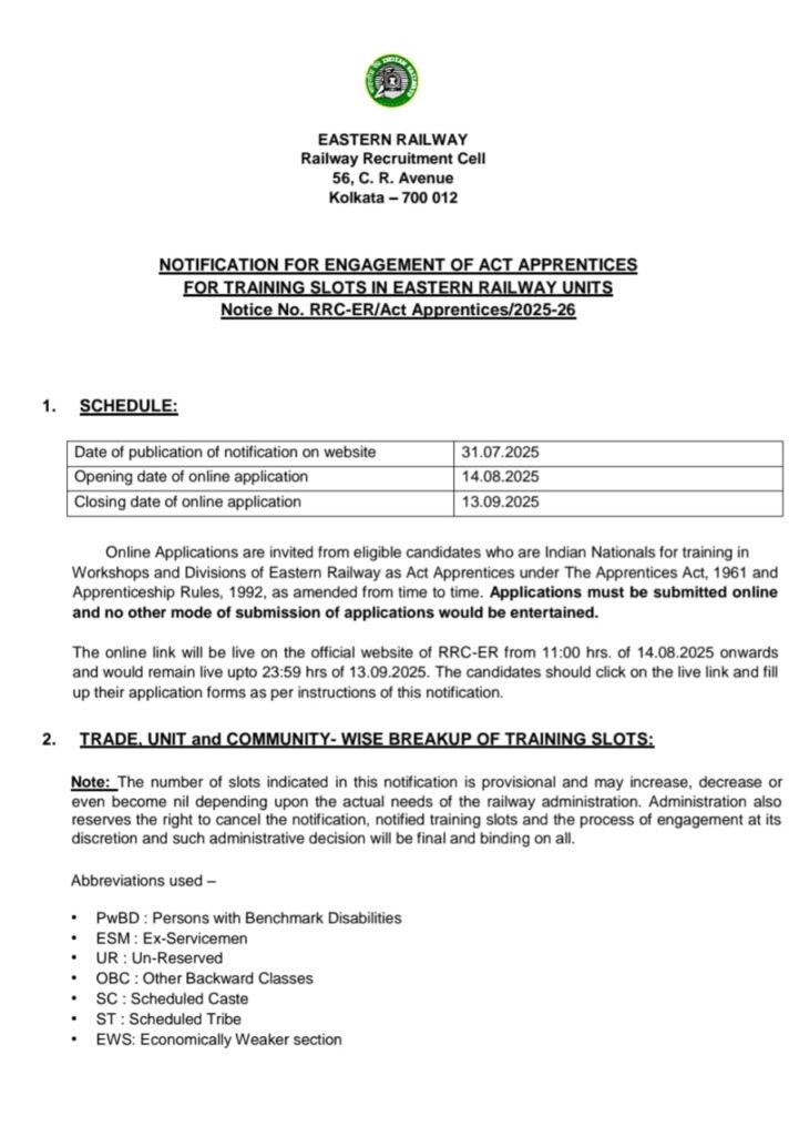RRC Eastern Railway Apprentices Recruitment 2025